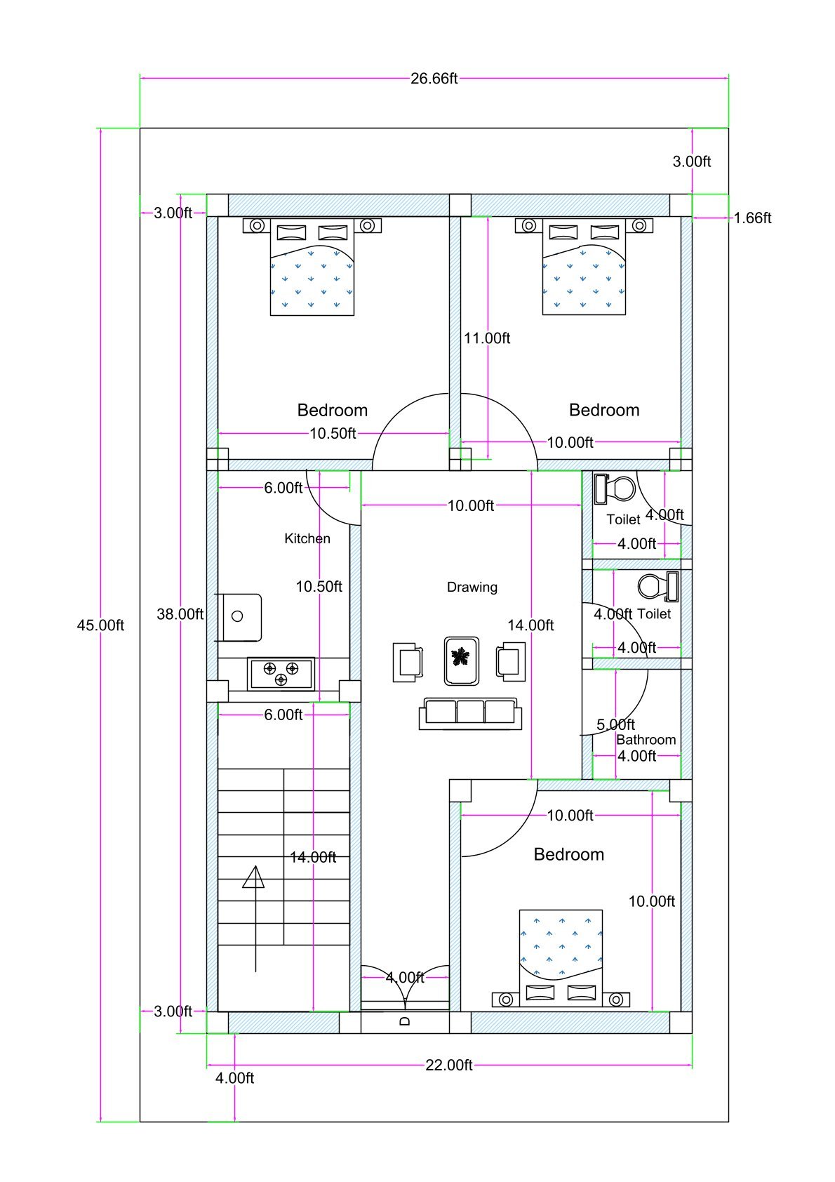 Explore this intelligently designed 22×40 west-facing 3BHK house plan (actual built-up size approximately 22 ft × 39 ft), constructed on a 25×45 plot (actual plot size approx. 26.6 ft × 45 ft). The layout is thoughtfully planned with proper setbacks and ventilation space on all sides.