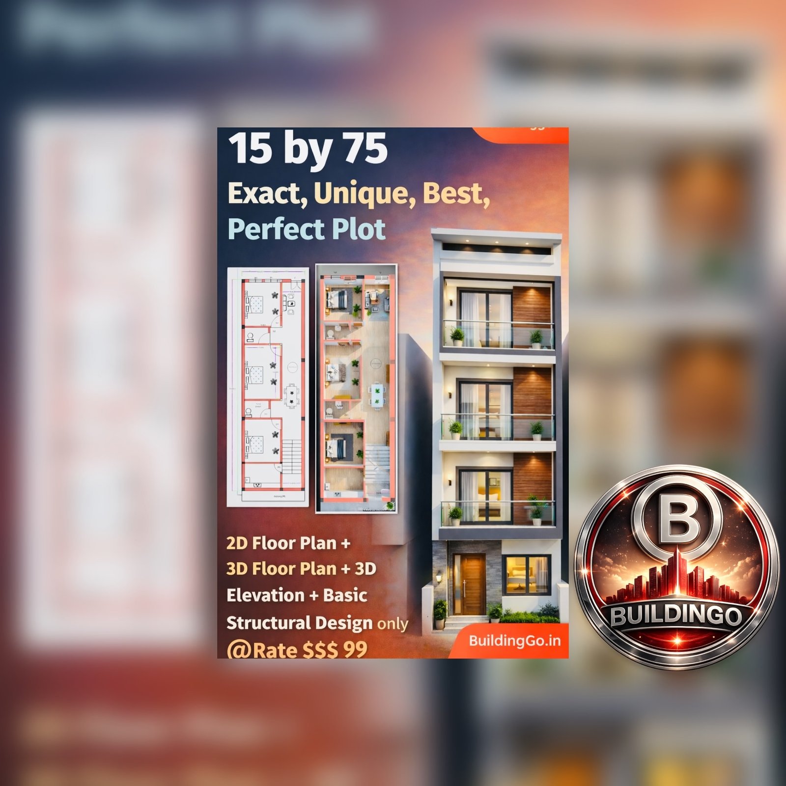 The design emphasizes that the package includes a 2D floor plan, 3D interior floor plan visualization, 3D front elevation, and basic structural design. The bold headline communicates the uniqueness and perfection of the 15 by 75 narrow plot layout, targeting homeowners searching for optimized narrow plot house plans.