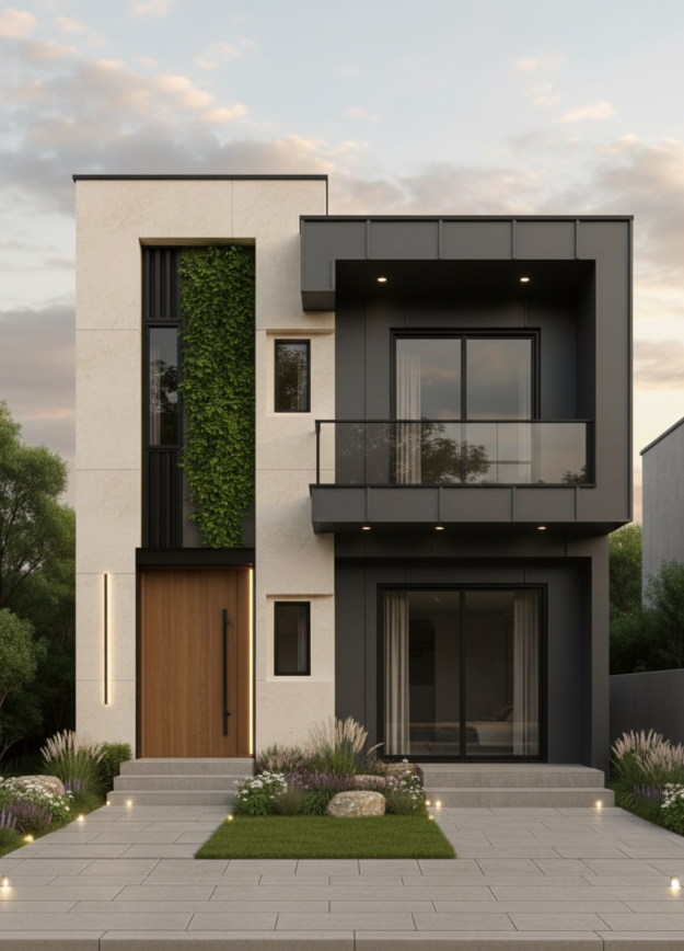 ₹99.00 Download Buildingo Complete Designs @ ₹9915×36 Modern House Front Elevation – Double Balcony Narrow Plot Contemporary Design | Buildingo