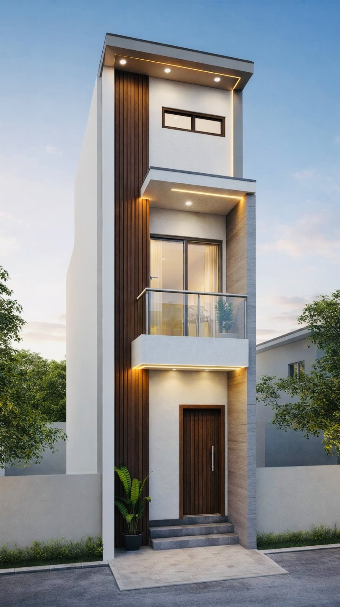 Complete 9×40 feet house design with 2D floor plan, 3D elevation, structural design and trapezoidal rear width (7.83 ft). Ground plus floors modern narrow plot home.