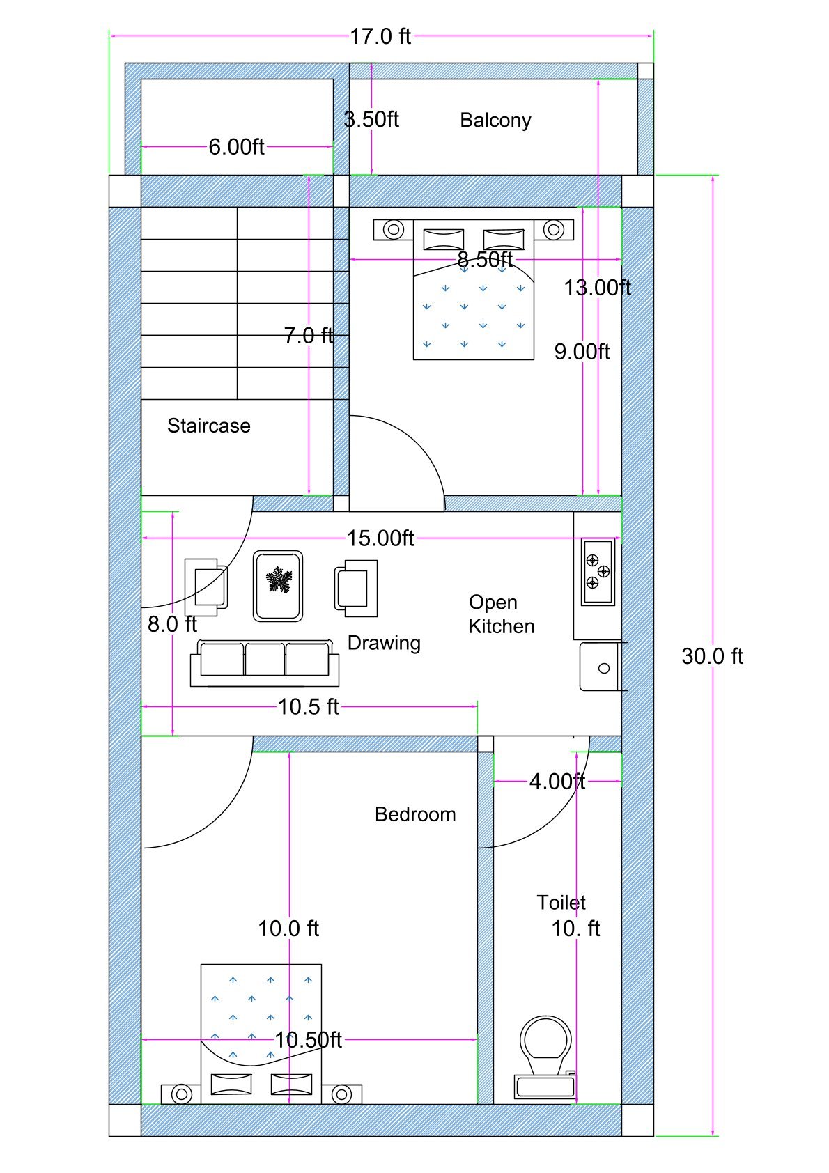 Step into a smartly crafted 17×30 feet 2BHK house plan that blends comfort with a modern open-layout concept. Designed for compact urban plots, this home stands out with its inviting front balcony — a perfect spot for morning tea, natural light, and ventilation.