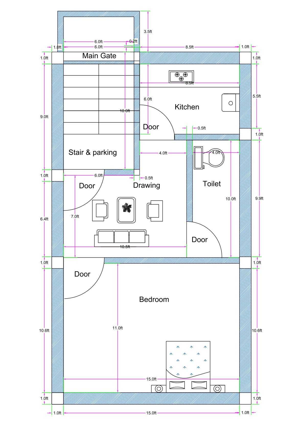This 17×30 feet 1BHK house plan is not just an architectural layout — it is a structurally detailed and construction-ready drawing. Designed on the same 17-foot width and 30-foot depth footprint, this version includes a well-planned balcony while maintaining complete structural clarity.