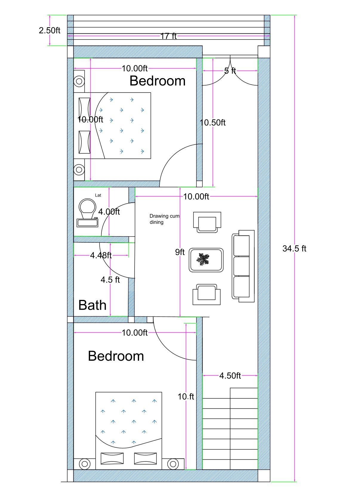 Every dimension in this 17-foot wide and 36.5-foot deep layout is clearly marked for execution clarity. The circulation flow between bedrooms, bath, toilet, and living area has been carefully planned to avoid congestion. This east-facing Vastu-compliant home layout is ideal for families seeking spiritual alignment combined with practical planning on a compact urban plot configuration.