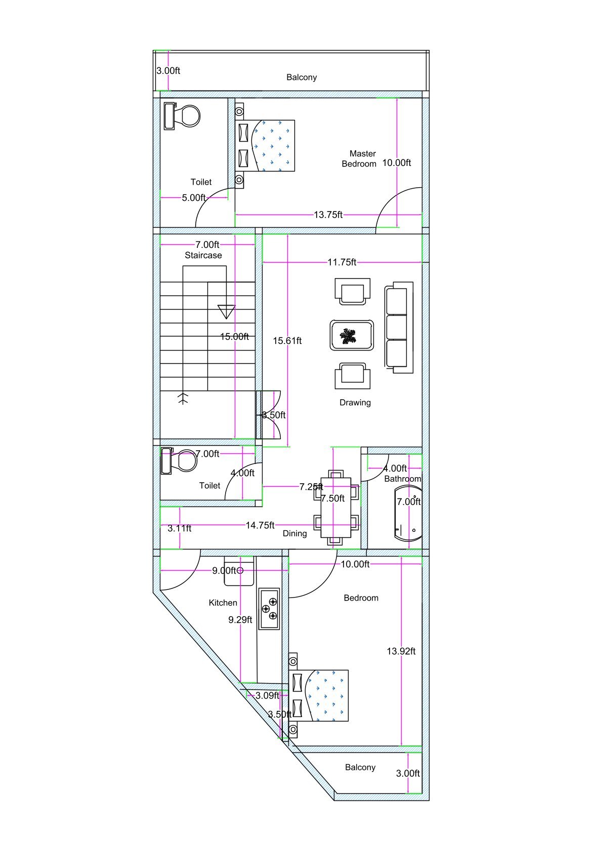 The design features a spacious drawing room positioned centrally, allowing comfortable seating arrangements and guest interaction. Adjacent to the drawing area is a dedicated dining space that connects efficiently to the kitchen, ensuring smooth daily movement and functionality. The kitchen is uniquely shaped to adjust to the irregular front plot angle, making efficient use of otherwise unused corner space.