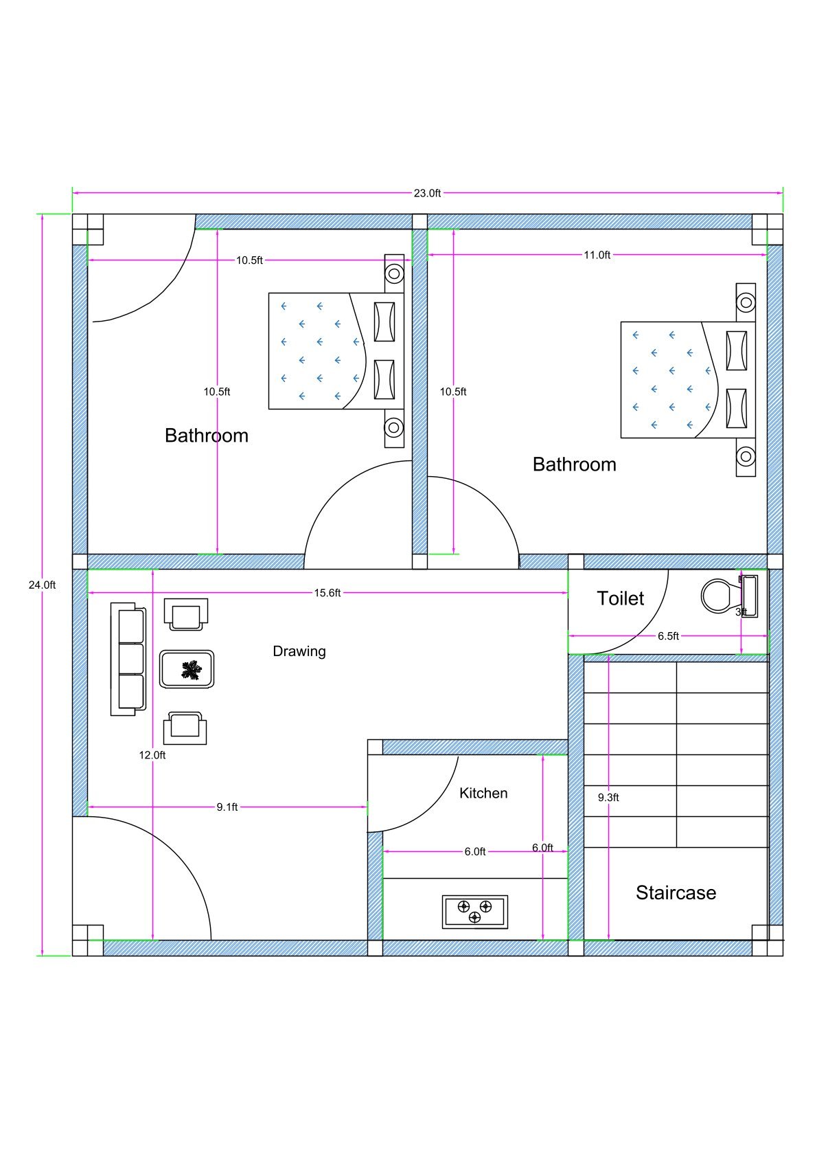 This 23×24 ft 2BHK house plan is designed for compact residential plots where space-saving and smart planning are essential. Despite the small dimensions, the layout ensures complete functionality, offering two bedrooms, a drawing room, a kitchen, a toilet, and a staircase—all arranged efficiently within a square-shaped plot.