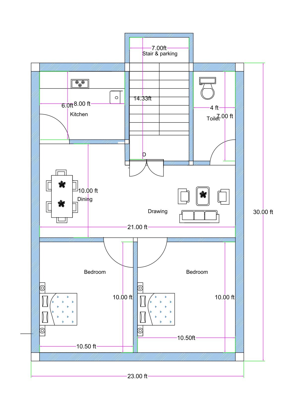 This 23×30 2BHK house plan is perfectly suited for compact plots where space efficiency, ventilation, and future growth potential are essential considerations.