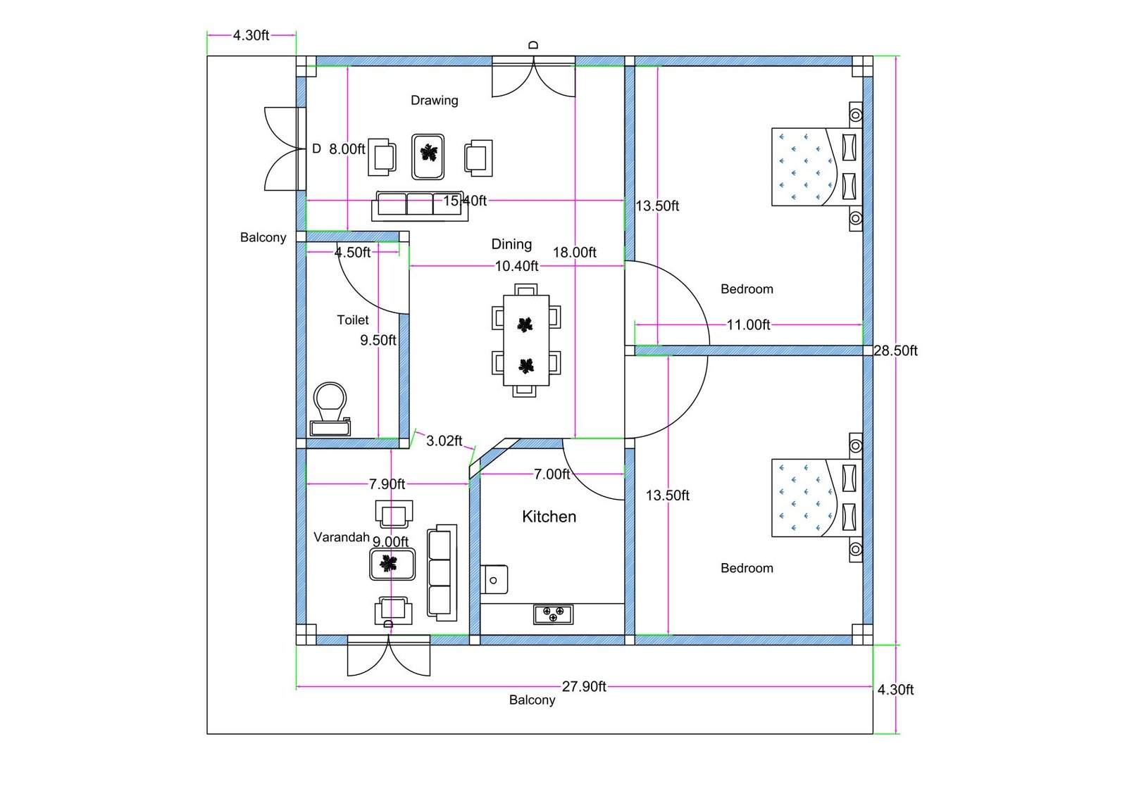This 28×28 ft 2BHK house plan (actual size 27.90×28.50 ft) is designed for compact square plots and offers a perfect balance of comfort, ventilation, and functional living space. The plan includes two bedrooms, a drawing room, dining space, kitchen, verandah, toilet, and two separate balconies—making it an ideal layout for small families looking for modern yet affordable home planning.