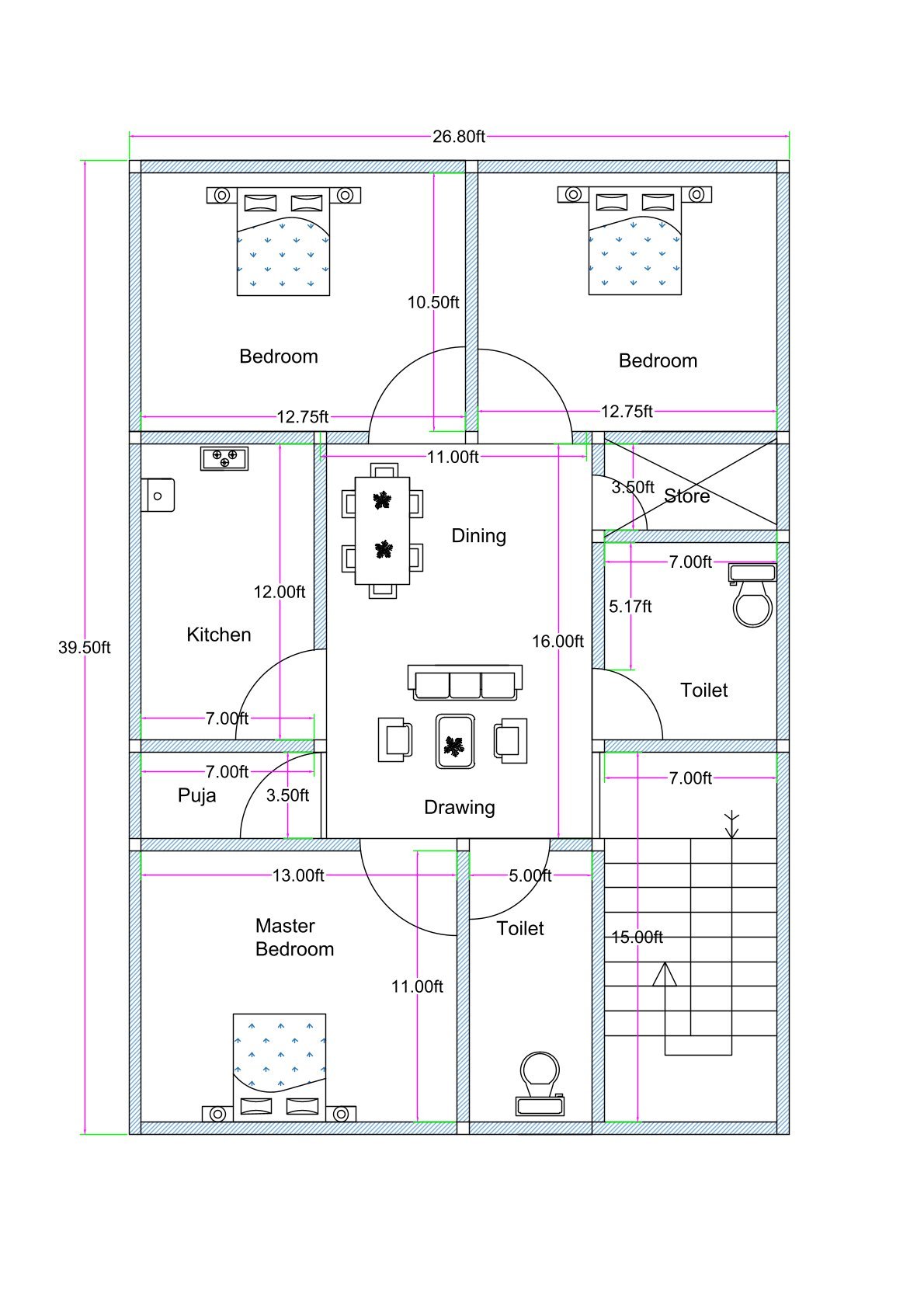 This 27×40 (actual 26.80×39.50) north-facing 3BHK plan is perfect for homeowners seeking rental income potential, smart space utilization, and future expansion flexibility.