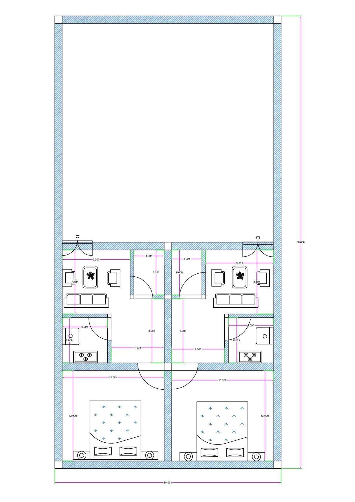Explore this practical 30×60 duplex house plan featuring two symmetrical 2BHK units designed for rental income or extended family living. The 30-foot frontage and 60-foot depth allow efficient division of space into two independent residential sections while maintaining proper circulation and structural balance.