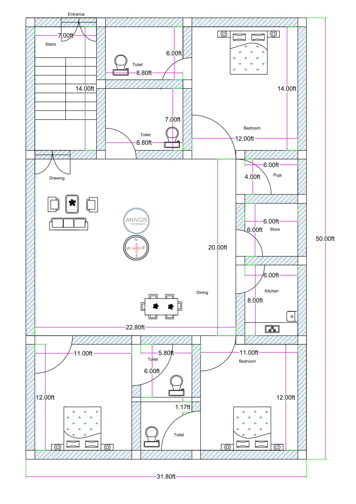 This beautifully structured 3BHK house plan for a 30×50 plot (with the drawing optimized to 31.8×50 ft) is a perfect design for families looking for a spacious, open, and well-connected residential layout. The plan begins with a frontal staircase area measuring 14 ft in length and 7 ft in width, designed to provide clear and uninterrupted access to upper floors. Adjacent to the staircase are two functional toilets (each 6×8.8 ft), ensuring high utility and convenience for both residents and guests.