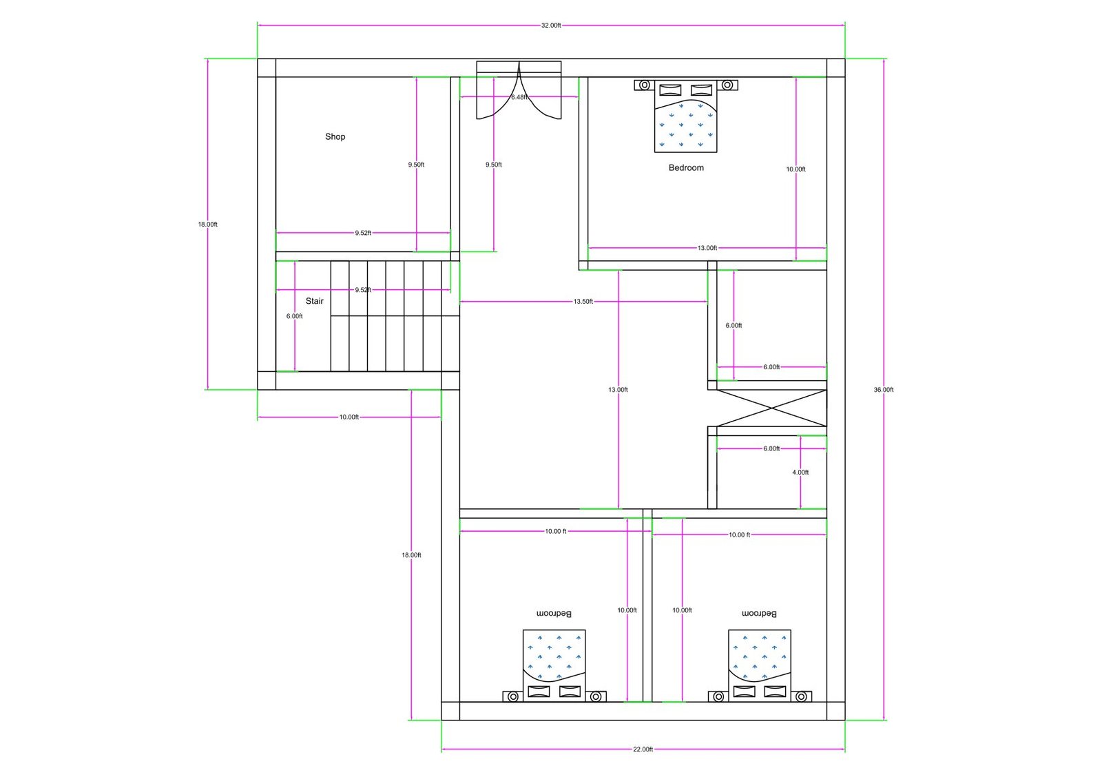 This well-planned 3BHK house design for a 30×40 plot, drawn at an actual construction-friendly size of 32×36 ft, is perfect for homeowners who want a mixed-use house with both residential and commercial functionality. The layout includes a front-side shop, allowing the owner to run a small business, rental shop, boutique, or office space without disturbing the privacy of the home. This integration of a commercial unit at the front makes the layout ideal for roadsides, market-facing properties, and families looking for an additional monthly income source.
