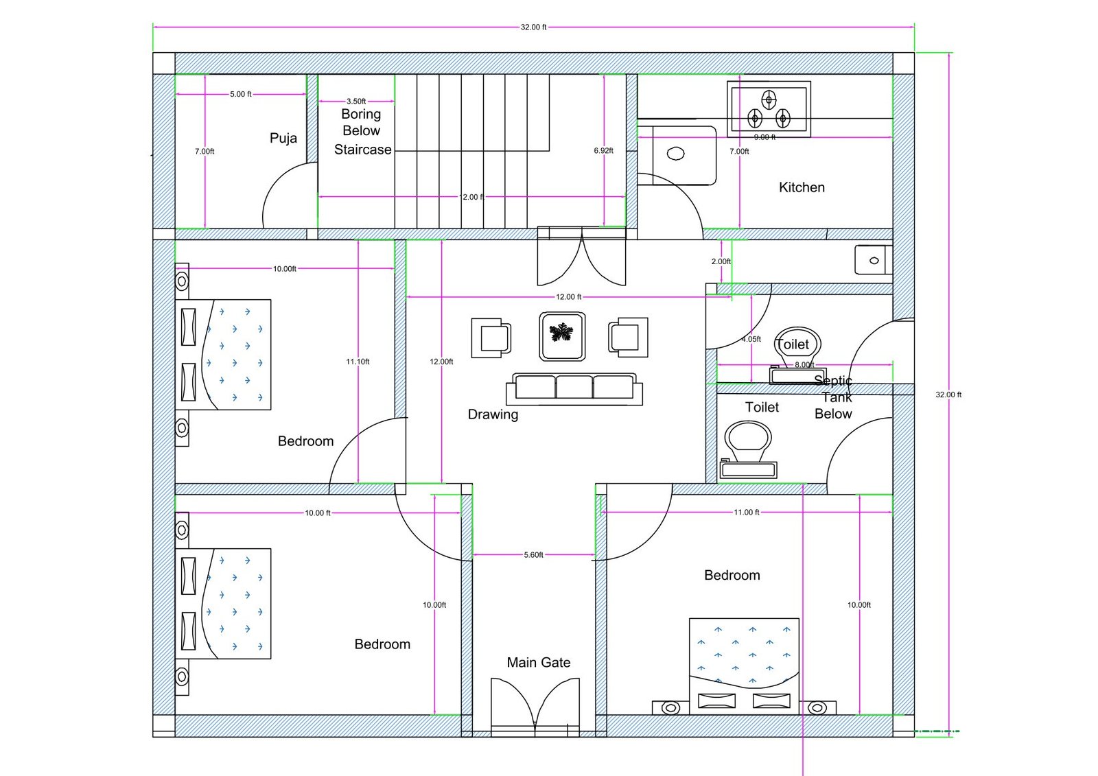 This efficiently planned 3BHK house plan for a 30×30 plot—built using an actual layout size of 32×32 ft—is an ideal design for families who need a compact, functional, and vastu-aligned home layout within a small plot area. Despite its compact footprint, the layout uses space intelligently to provide three spacious bedrooms, two toilets, a central drawing room, and a fully functional kitchen.