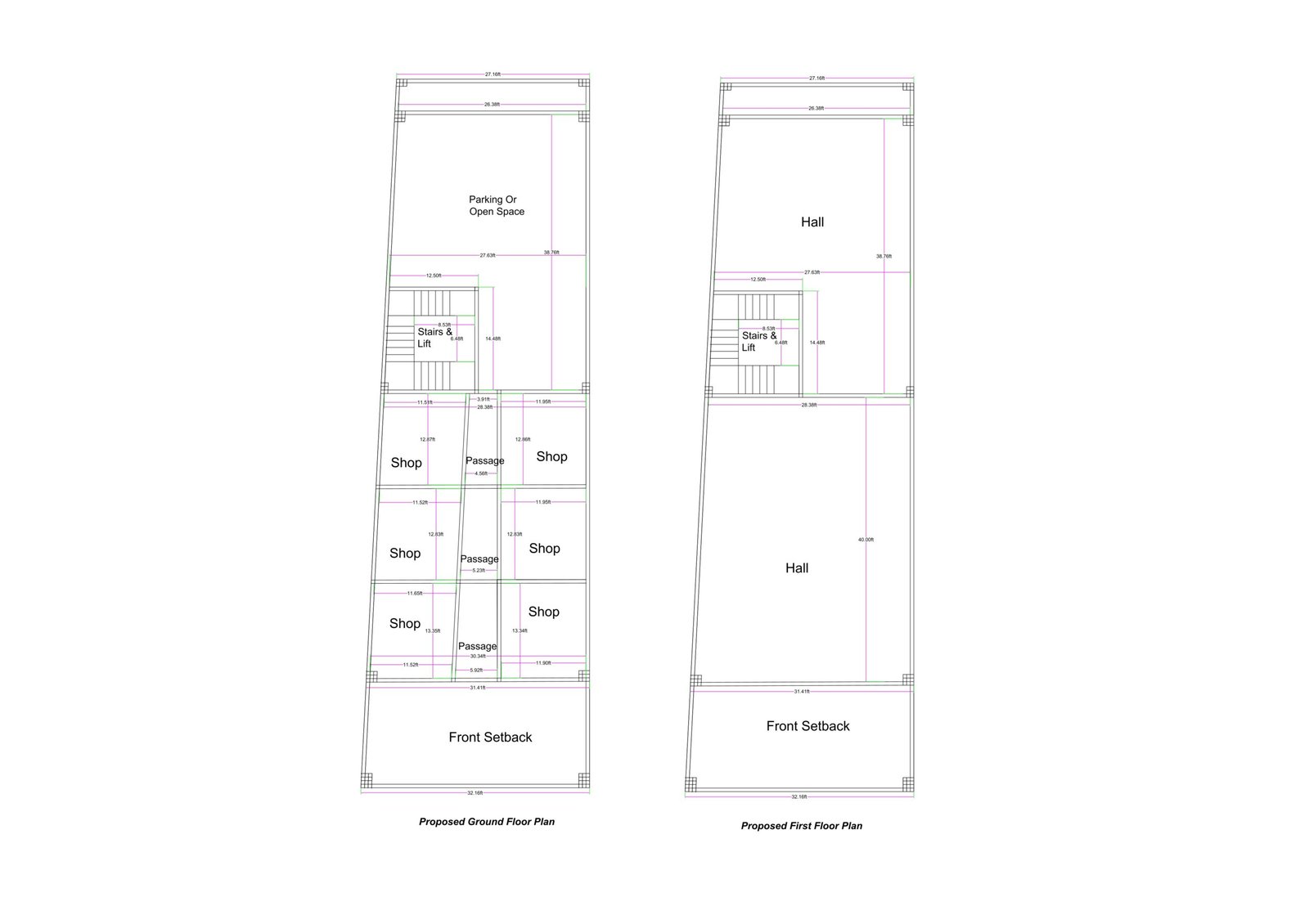 This 22×70 ft commercial building plan (actual size 22×70 ft) is designed for maximum rental output and efficient utilization of a narrow commercial plot. The layout includes multiple shops on the ground floor, a central staircase and lift, rear parking/cycle space, and a large hall on the first floor, making it ideal for retail, office, and commercial use.