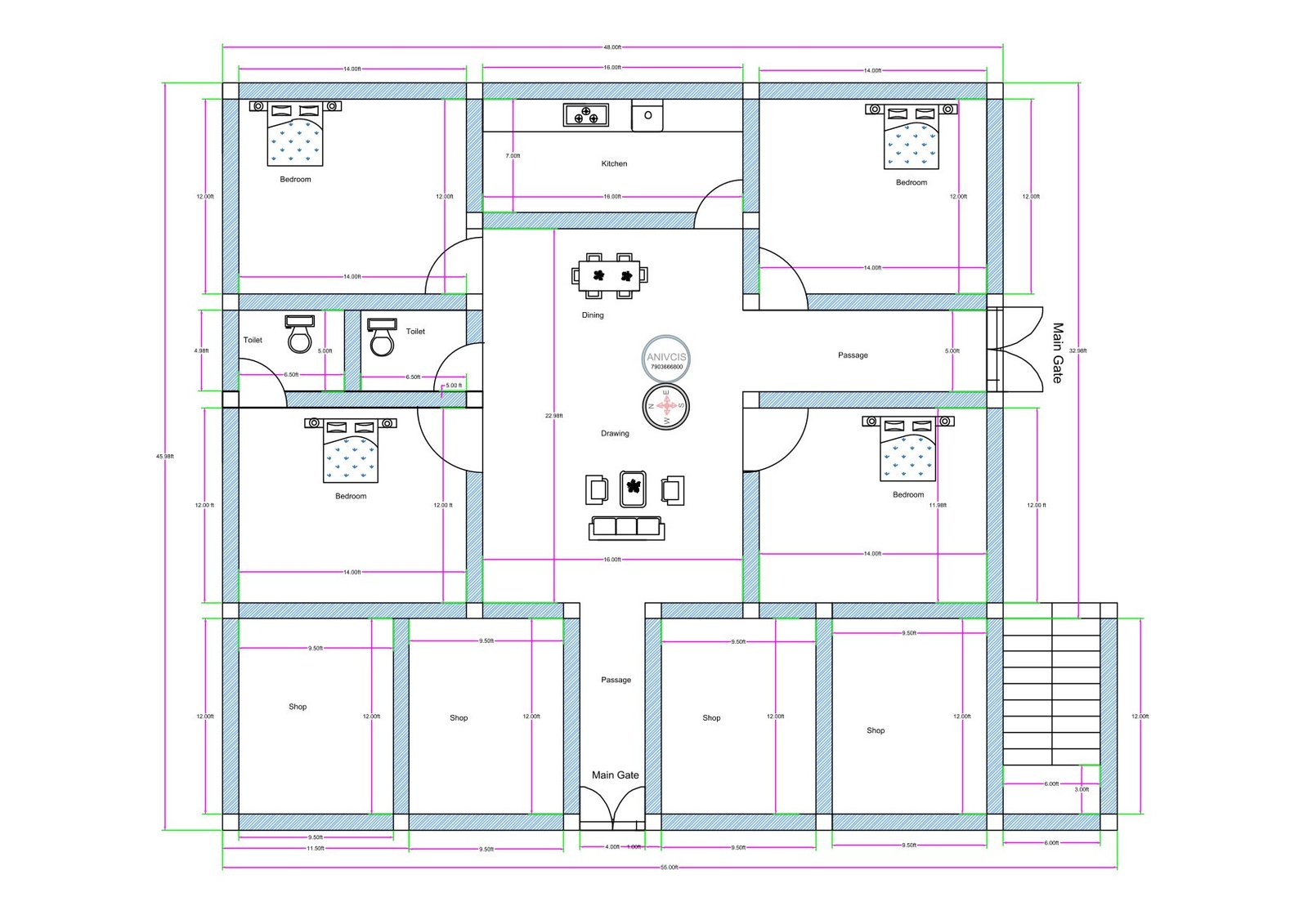 The plan features multiple commercial shops in the front portion, aligned symmetrically along the width of the building. These shops have independent access from the main road, making them perfect for retail, small businesses, offices, or rental units. The uniform layout ensures high visibility and maximum frontage, which increases commercial value.