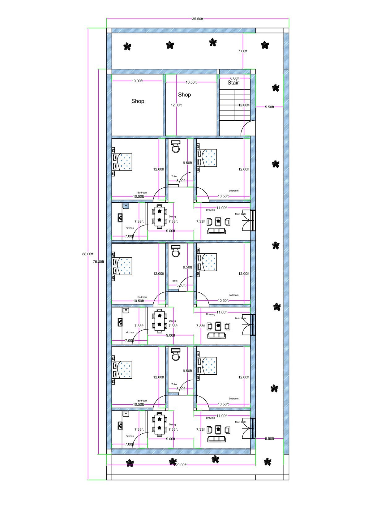 This intelligently structured multi-unit residential and commercial house plan for a 35×85 plot—drawn using an actual size of 35.5×88 ft—is designed for maximum rental income, long-term investment, and efficient use of a long rectangular plot. The design combines two commercial shops at the front with multiple 2BHK rental units behind them, making it an excellent layout for owners seeking steady monthly income from both residential and commercial tenants.