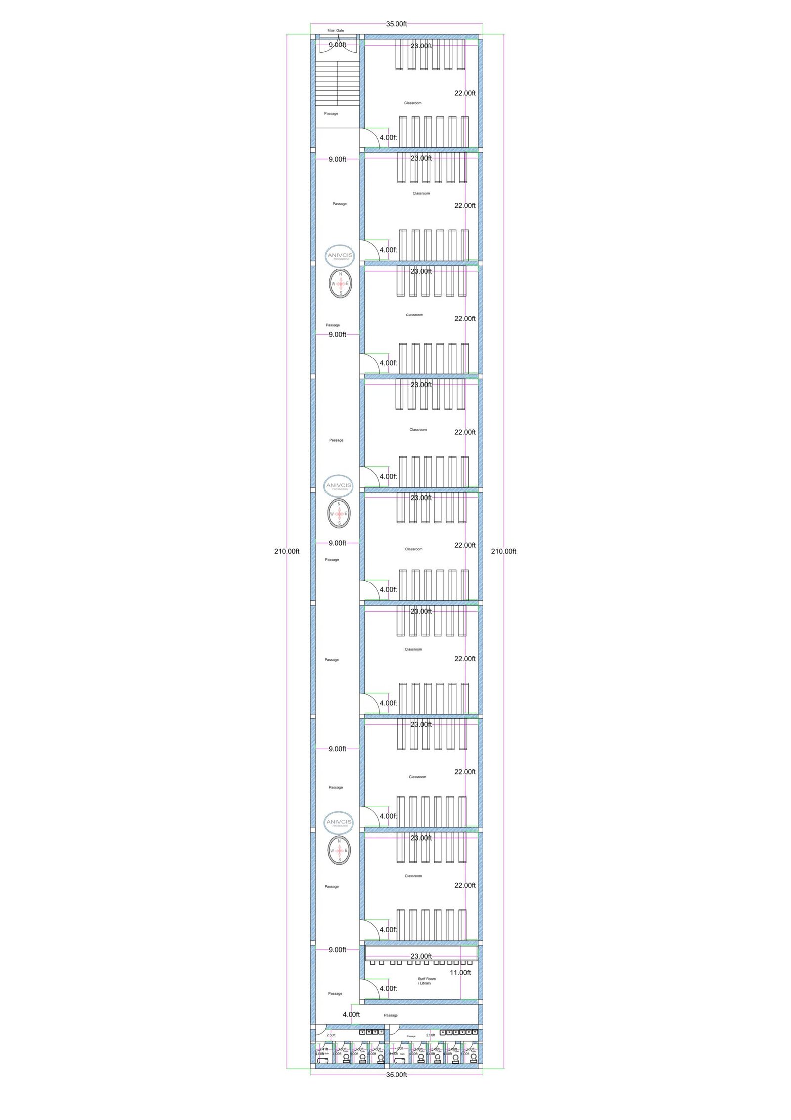 Overall, this 35×210 (actual 35×210 ft) school building layout is a highly efficient, student-friendly, structurally balanced, and scalable design suitable for modern educational institutions.