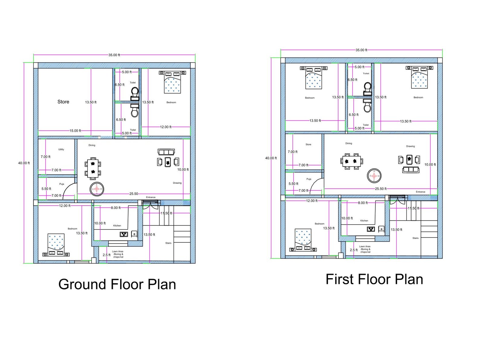 This thoughtfully planned 3BHK duplex house plan for a 35×40 plot—with an actual drawing size of 35×40 ft—is an excellent example of functional, modern, and vastu-aligned residential design. It includes both ground floor and first floor layouts, making it ideal for families who prefer vertical expansion, privacy between floors, and a well-connected internal structure.