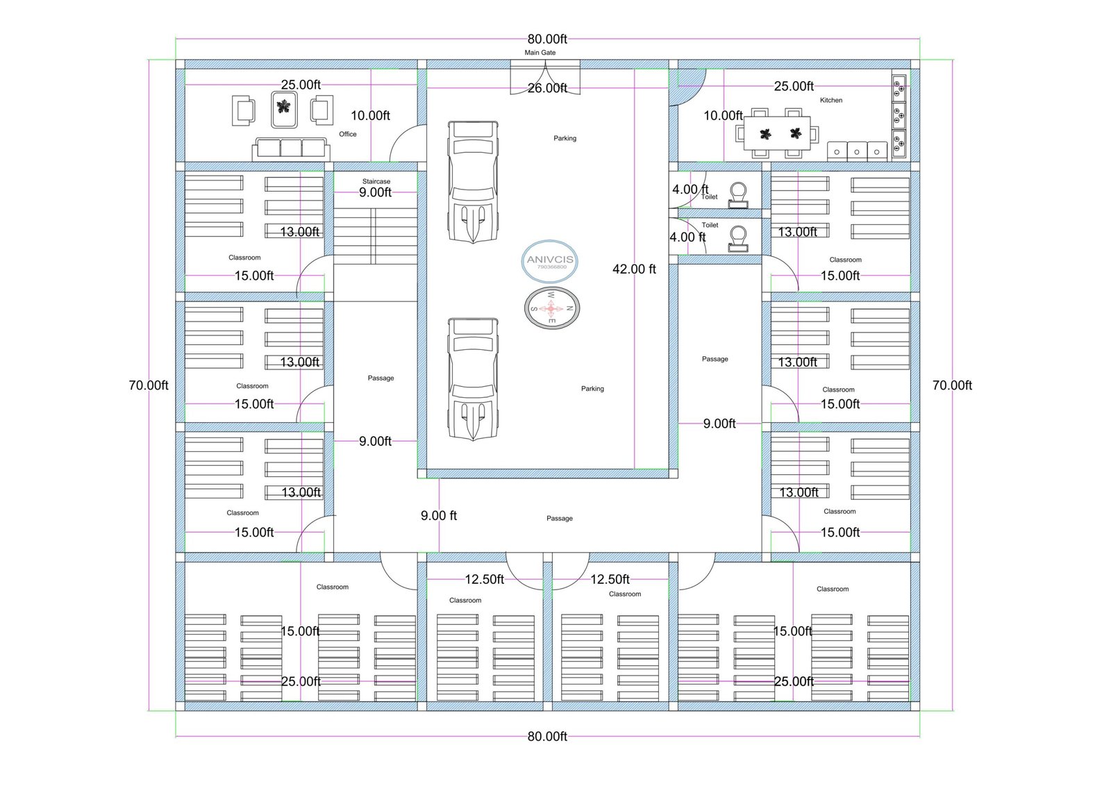 With its clear dimensions, organized structure, and thoughtful room placement, this 80×70 ft 2D educational floor plan provides an optimal foundation for constructing a modern, well-managed, and student-friendly academic institution.