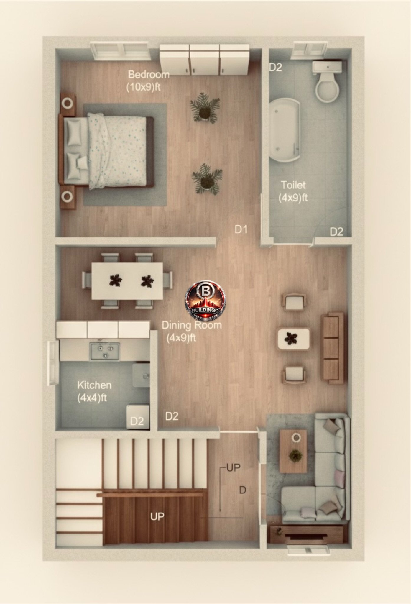 Visualize your dream home with this realistic 3D floor plan of a 15×25 house (actual size 16.5×24 feet). This compact yet functional design showcases a fully furnished layout including a cozy bedroom (10×9 ft), attached toilet (4×9 ft), dining space (4×9 ft), modular kitchen (4×4 ft), and an 8×11 ft drawing room designed for comfort and efficiency.