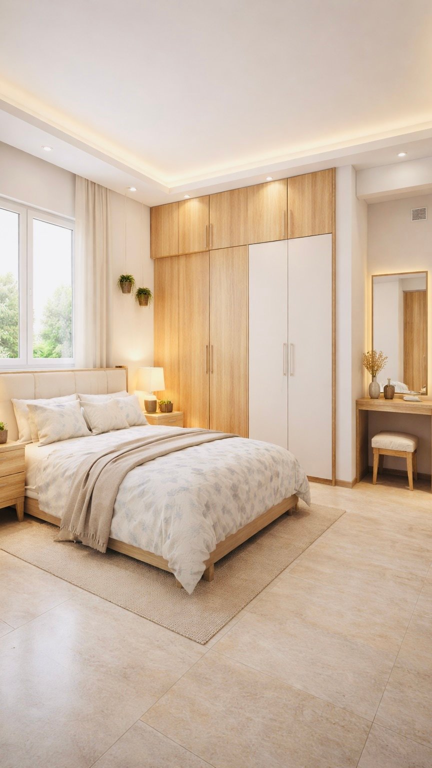 This beautifully designed modern 1BHK bedroom interior showcases how a compact space can be transformed into a luxurious and functional living area using smart design principles. The room features a queen-size bed with soft neutral bedding, complemented by a warm beige and light wood color palette that creates a calm and inviting atmosphere. A full-height wooden wardrobe with overhead storage maximizes space efficiency, making it ideal for small Indian homes where storage is essential.